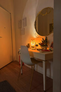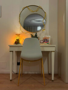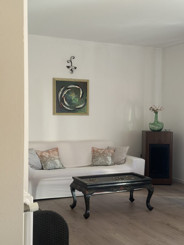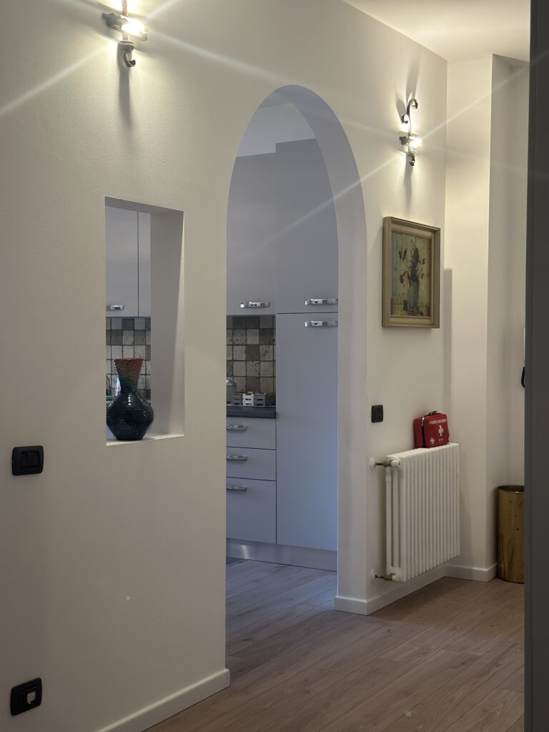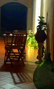 Mi ha colpita la cura evidente dei dettagli: un libro scelto sul tavolino, un decoro su ogni mensola. E poi il tempo trascorso sotto il porticato, immerso nell’ombra nei giorni più caldi, mentre la luce serale addolciva la notte.